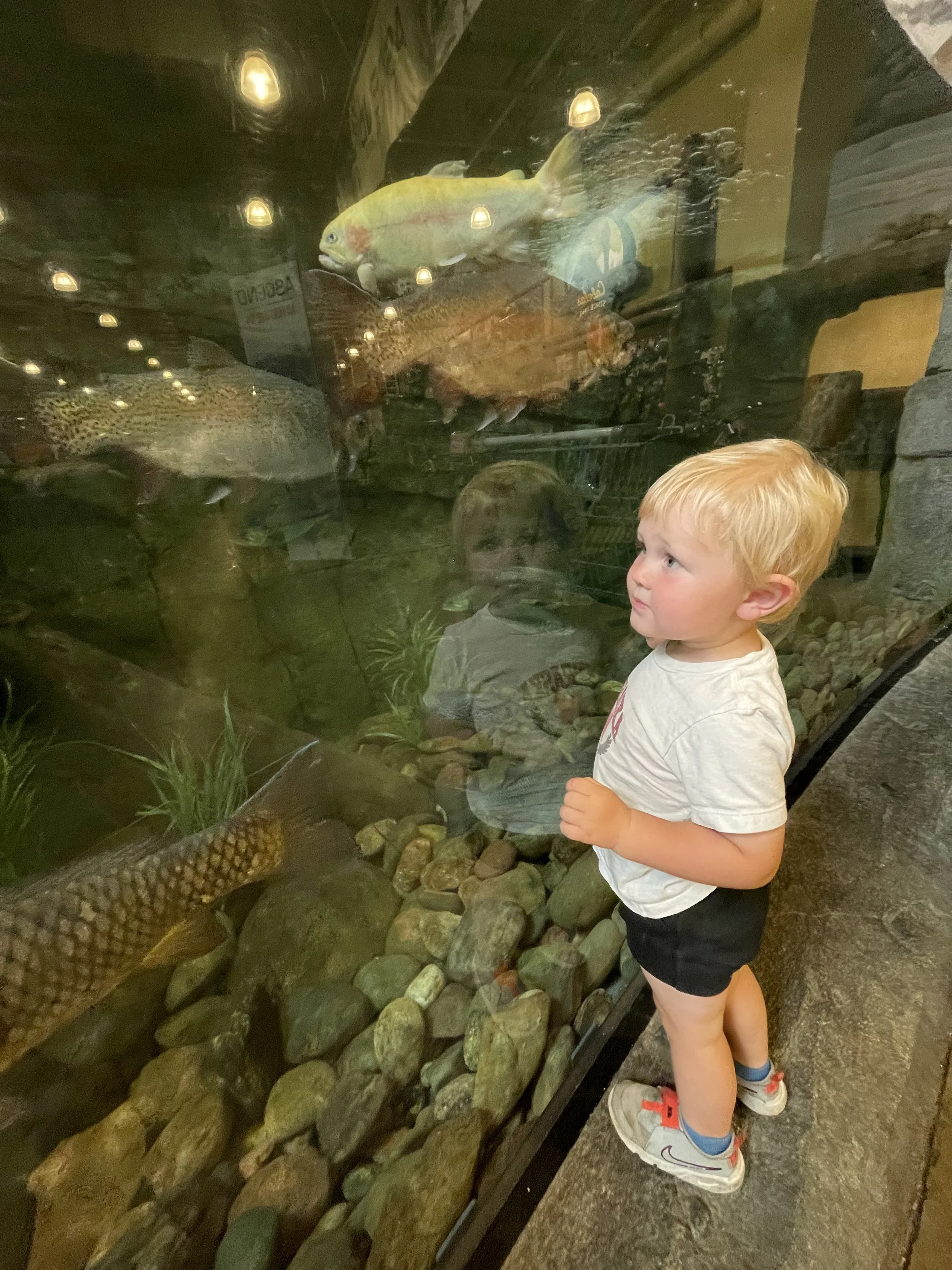 I am a country girl. I love to be outdoors. Hence why we started roamingtylers and you can read more on that post here. But my husband and I love to shop at Cabelas and Bass Pro Shops. They have now since merged together so they are the same company just with different names. However, we were there just recently and you can see, Case loving the fishes.