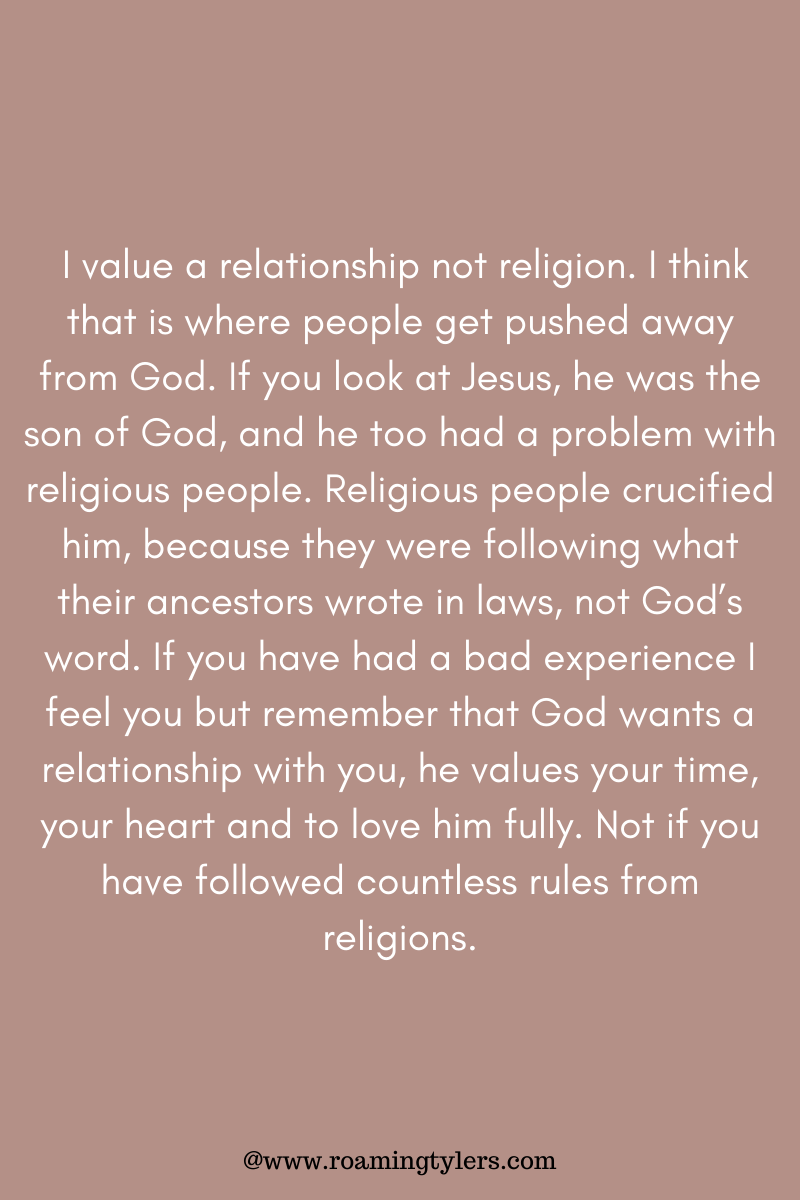 I have been a Christian for my whole life. I grew up Catholic but only am practicing as a Christian now, because I value a relationship not religion. I think that is where people get pushed away from God. If you look at Jesus, he was the son of God, and he too had a problem with religious people. Religious people crucified him, because they were following what their ancestors wrote in laws, not God’s word. If you have had a bad experience I feel you but remember that God wants a relationship with you, he values your time, your heart and to love him fully. Not if you have followed countless rules from religions.